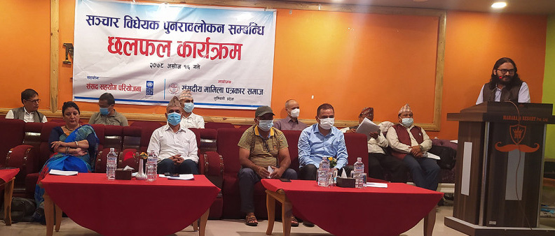 शनिबार संसदीय मामिला पत्रकार समाजको आयोजनामा भएको सञ्चार विधेयक पुनरावलोकन सम्बन्धी छलफल कार्यक्रममा सहभागीले विधेयकले संविधानको धारा १७ को स्वतन्त्रताको हक र धारा १९ को सञ्चारको हकसँग बाझिएको बताए । संविधानको प्रावधान विपरित संचारमाध्ययमलाई अंकुश लगाउने गरी सञ्चारमाध्ययमसम्बन्धी विधेयक अनुसार सञ्चारमाध्ययमको दर्ता अनुमति प्रकाशन प्रसारण सञ्चालन नविकरण र नियमन तथा प्रदेश सञ्चार परिषद्को स्थापना गरिए नागरिकको स्वतन्त्रताको हक खोसिने, सञ्चारमाध्ययम बन्द हुने र पत्रकारहरुको काम खोसिने उनीहरुले दाबी गरे ।