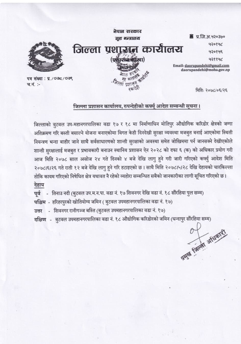 बुटवल उपमहानपालिका १७ मा निर्माणाधिन मोतीपुर औद्योगिक कोरिडोर क्षेत्रको जग्गामा सुकुम्बासी समूह बनाइ जग्गा कब्जा गर्ने र प्रहरीबीच झडप भएपछि शान्ति सुरक्षालाइ मध्यनजर गरी प्रशासनले कर्फु लगाएको थियो।
