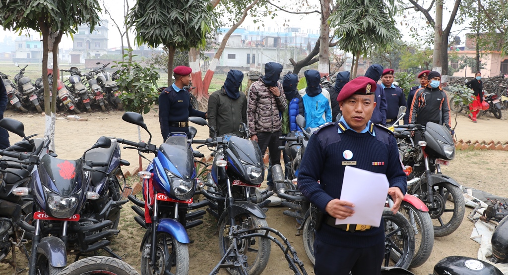 बाँके बैजनाथ । बाँके प्रहरीले मोटरसाईकल चोरेर विभिन्न पहाडी जिल्लामा बेच्ने गिरोहलाई पक्राउ गरेको छ । जिल्ला प्रहरी कार्यालय बाँकेले बुधवार पत्रकार सम्मेलन गरेर मोटरसाईकल चोरीमा संलग्न ६ जनालाई पक्राउ गरेको जनाएको छ ।