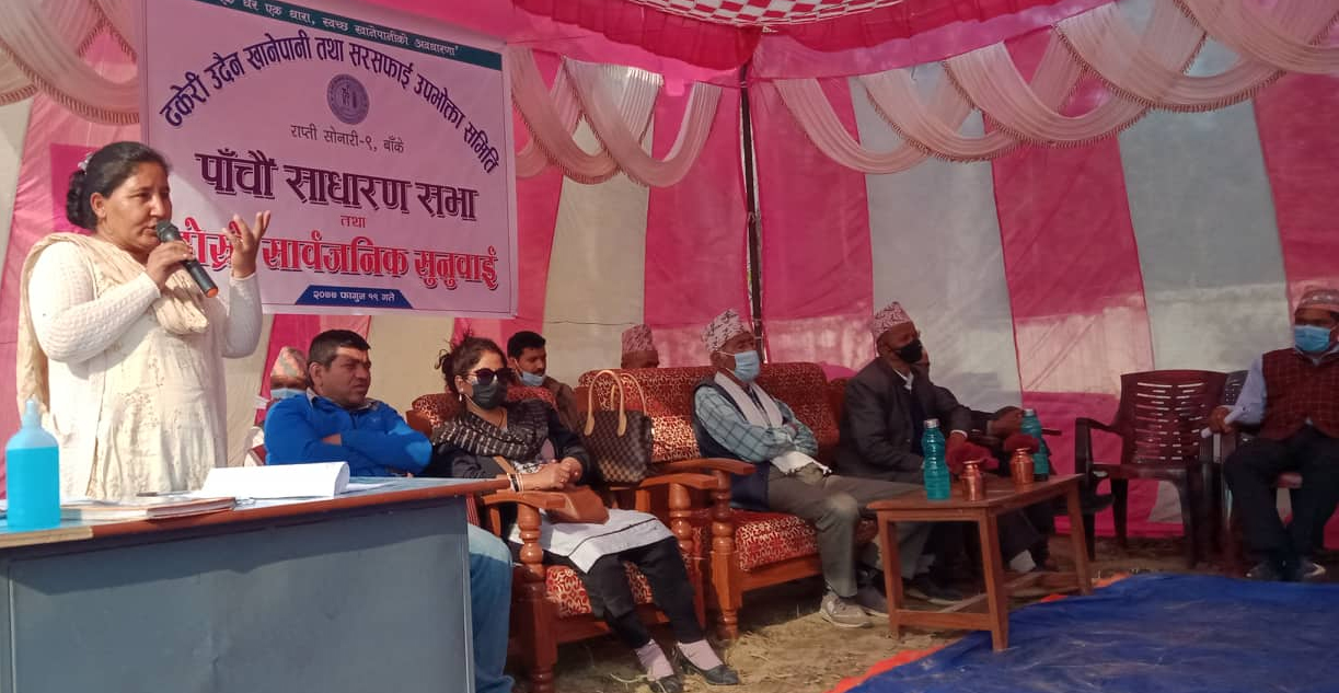 बाँके बैजनाथ । बाँकेको राप्तीसोनारी गाउँ पालिका वडा नं. ९ स्थित ढकेरी उदैन खानेपानी तथा सरसफाई उपभोक्ता समितिको दोस्रो सार्वजनिक सुनुवाइ तथा चौथो साधारणसभा बुधबार सम्पन्न भएको छ ।