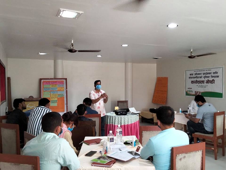 फियान नेपालका क्षेत्रिय संयोजक सुरेश कुमार गौतमले खाद्य अधिकारको राष्ट्रिय तथा अन्र्तराष्ट्रिय परिवेश, नेपालमा खाद्य सम्बन्धीको वर्तमान अवस्था लगायतका विषयमा कार्यपत्र प्रस्तुत गरिएको थियो ।