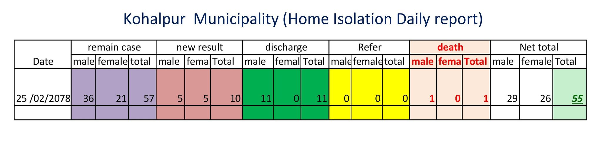 कोहलपुर । कोहलपुर नगरपालिका विभिन्न वडा मा होम आइसोलेसन मा रहेका कोरना संक्रमित संख्या ५५ मा झरेका छन् ।