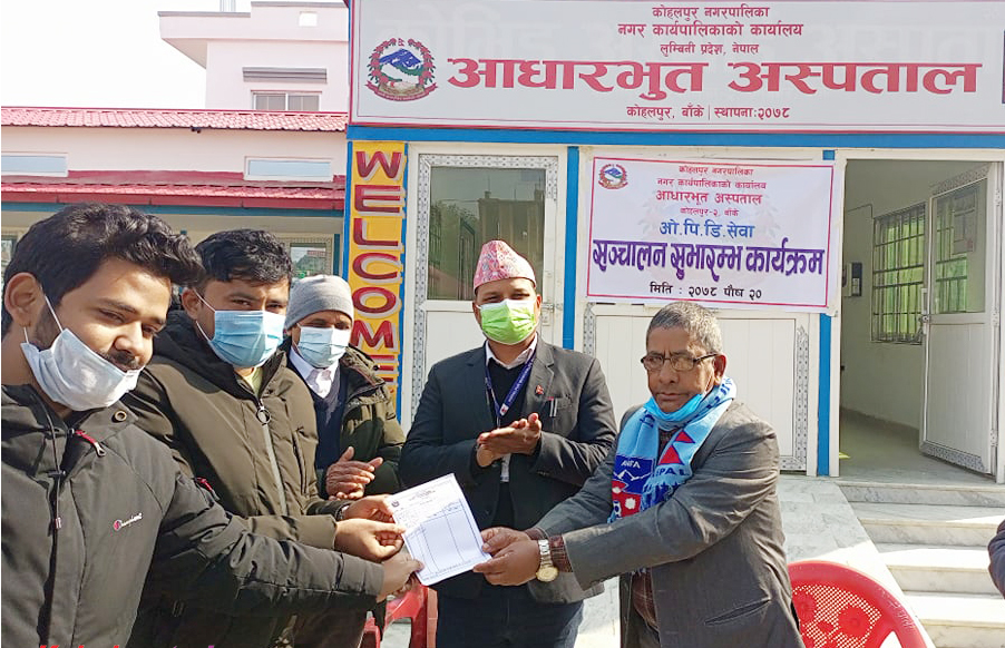 बाँके\ बाँकेको कोहलपुर नगरपालिकाले वडा न २ स्थित सामुदायिक आयुर्वेद तथा प्राकृतिक अस्पतालमा ओपिडि सेवा सहितको आधारभुत अस्पताल सञ्चालनमा ल्याएको छ । कोहलपुर नगरपालिका प्रमुख लुट बहादुर रावतले उद्घाटन गरी ओपिडि सेवा सहितको आधारभुत अस्पतालको आजबाट सञ्चालनमा आएको छ ।