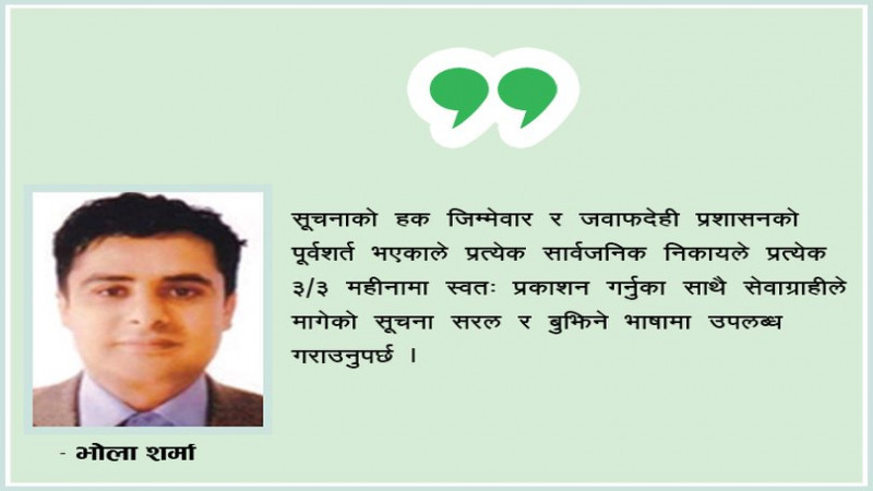 सूचनाको हक जिम्मेवार र जवाफदेही प्रशासनको पूर्वशर्त भएकाले प्रत्येक सार्वजनिक निकायले प्रत्येक ३/३ महीनामा स्वत: प्रकाशन गर्नुका साथै सेवाग्राहीले मागेको सूचना सरल र बुझिने भाषामा निर्धारित अवधिभित्र उपलब्ध गराउनुपर्छ ।