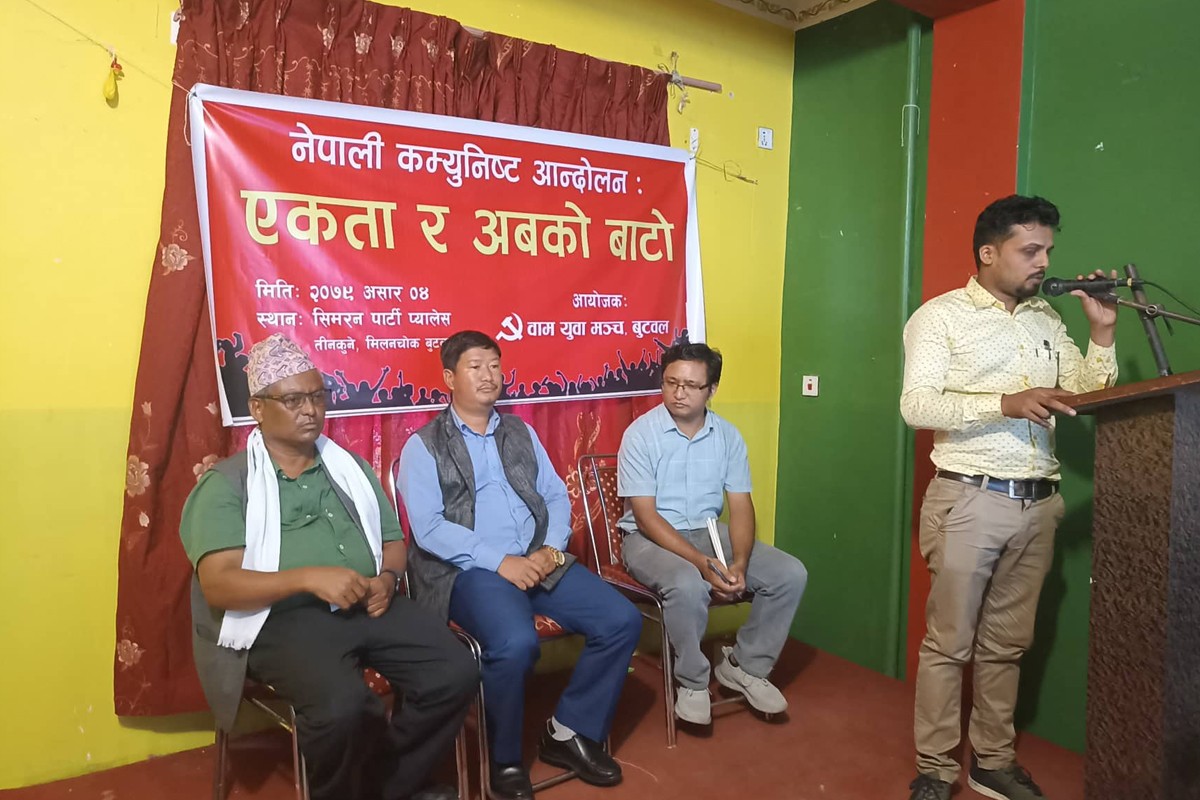 बुुटवल\नेपालमा कम्युनिष्ट पार्टीबीच फुटको शृंखला चलिरहेको बेला बुटवलमा वामपन्थी एकताका बारेमा बहस सुरु भएको छ। वाम युुवा मोर्चा बुुटवलले शनिबार नेपाली कम्युनिष्ट आन्दोलन एकता र अबको बाटोका विषयमा छलफल गराउँदै कम्युनिष्ट पार्टीहरुमा देखा परेको वैचारिक, राजनीतिक र सैद्धातिक विचलनका बारेमा बहस थालेको हो।