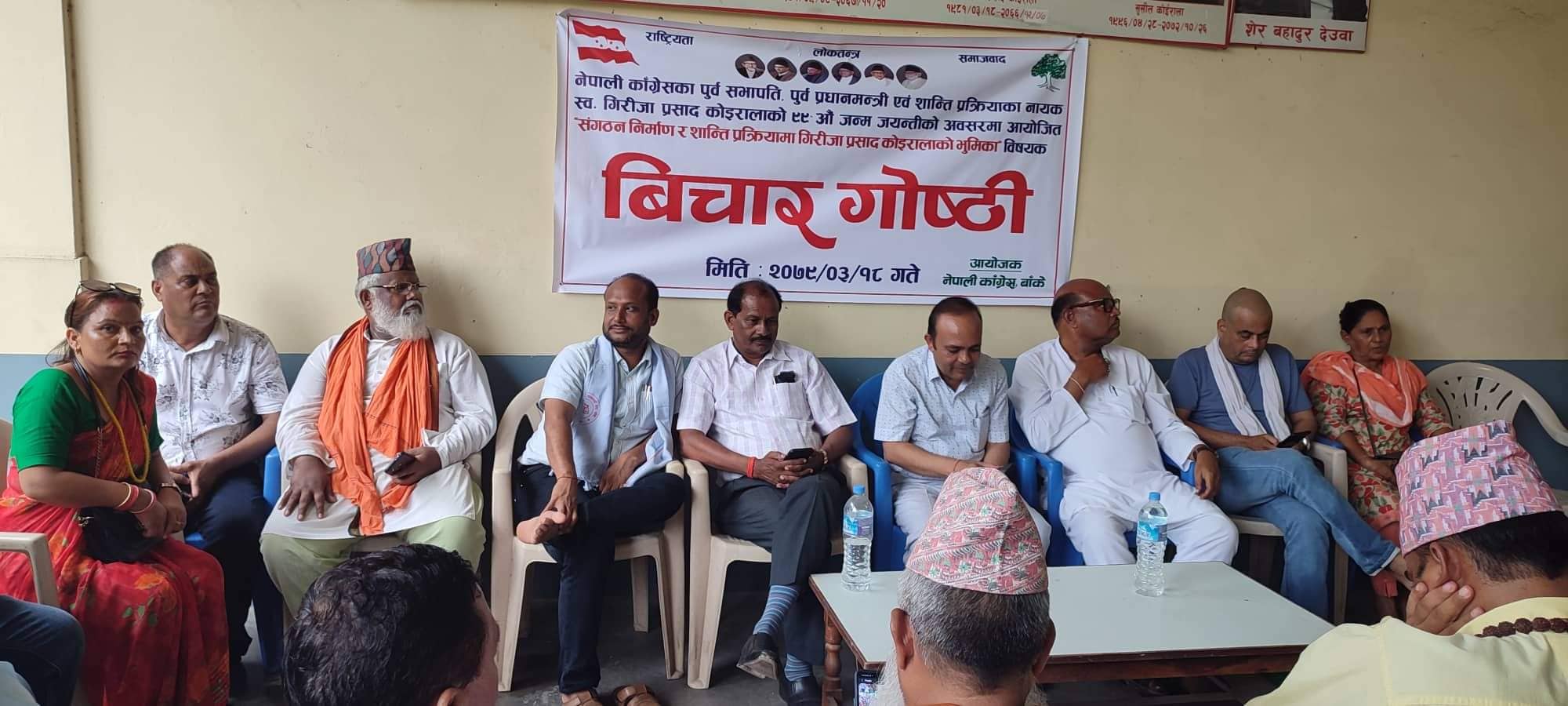 नेपाली कांग्रेस बाँकेले पार्टीका पूर्व सभापति एवम् पूर्व प्रधानमन्त्री स्वर्गीय कोइरालाको ९९औं जन्मजयन्तीका अवसरमा शनिवार पार्टी कार्यालय नेपालगञ्जमा आयोजना गरेको ’संगठन निर्माण र शान्ति प्रक्रियामा गिरिजाप्रसाद कोइरालाको भूमिका’ विषयक विचार गोष्ठीमा बोल्ने बक्ताहरुले कोइराला बहुप्रतिभाशाली र बहुआयामिक व्यक्तित्व भएको चर्चा गरे ।
