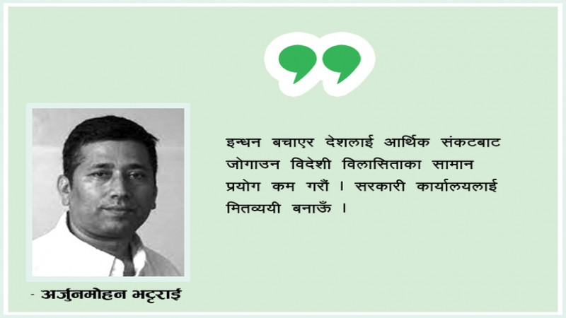 इन्धन बचाउन देशलाई आर्थिक संकटबाट जोगाउन विदेशी विलासिताका सामान प्रयोग कम गरौं । सरकारी कार्यालयलाई मितव्ययी बनाऊँ । सुनिन्छ, विद्युतीय सबारी चलाउने कर्मचारीले पनि सरकारी कार्यालयको इन्धनको कुपन लिन्छन् रे । सरकारी अड्ढामा केही समयलाई इन्धनको कुपन वितरण कम गर्नुपर्छ ।ग्यासको सट्टा विद्युतीय चूल्हो प्रयोग गरौं । सबै नागरिकले आफूलाई सुर्धान र राजनीतिक वृत्तबाट आफूलाई इमानदारी प्रस्तुत गर्न जरुरी छ । सरकारी कार्यालय मितव्ययी हुनुपर्छ, अनावश्यक फजुल खर्च कम गर्न प्रमुखले नै अहम् भूमिका निर्वाह गर्नुपर्छ । लेखक नेपाल विज्ञापन संघका कार्यकारी निर्देशक हुन् ।