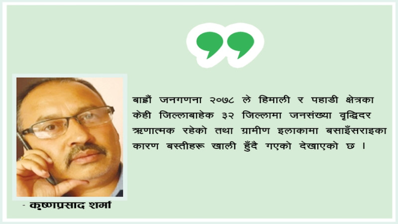 बाह्रौं जनगणना २०७८ ले हिमाली र पहाडी क्षेत्रका केही जिल्लाबाहेक ३२ जिल्लामा जनसंख्या वृद्धिदर ऋणात्मक देखिएको तथा ग्रामीण इलाकामा बसाइँसराइका कारण बस्तीहरू खाली हँुदै गएको, तराई र शहरी जनसंख्यामा वृद्धि भइरहेकाले भौगोलिक र जनसांख्यिकीय अवस्थामा दूरगामी असर देखिँदै छ । यसरी सृजना हुने विविध समस्याको समाधानका लागि आगामी वर्षको बजेटमा कुनै कार्यक्रम तथा नीतिगत व्यवस्थाहरू उल्लेख भएको पाइँदैन । विसं २०५१ मा नेकपा एमालेले ठूलो दलको हैसियतमा सरकार बनाई बजेटमा ‘आफ्नो गाउँ आफै बनाऊँ’ भन्ने कार्यक्रमबाट साविकका गाविसहरूमा सोझै रकम पठाउने व्यवस्था गरेको थियो । हिमाली/पहाडी इलाकामा बाटोघाटोको बढी समस्या रहेकाले सोही रकमबाट सडक निर्माणलाई पहिलो प्राथमिकतामा राखियो ।