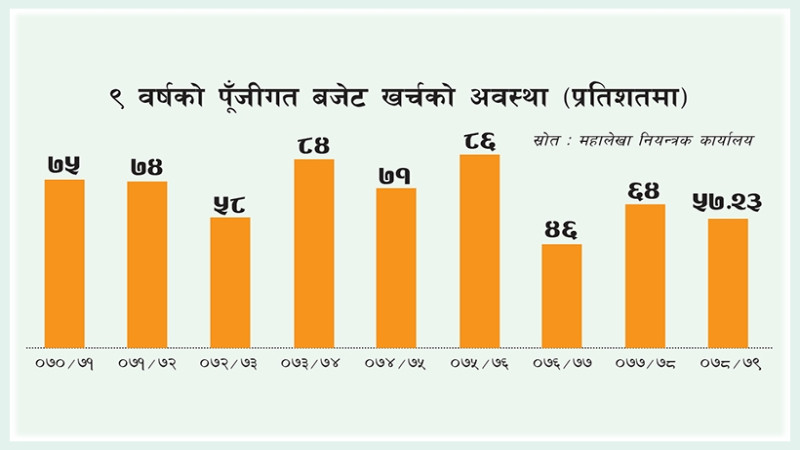 महालेखा नियन्त्रक कार्यालयका अनुसार आव २०७८/७९ मा पूँजीगततर्फ ३ खर्ब ७८ अर्ब ९ करोड बजेट विनियोजन गरेको सरकारले २ खर्ब १६ अर्ब ३७ करोड रुपैयाँ (५७ दशमलव २३ प्रतिशत) मात्र खर्च गरेको छ ।