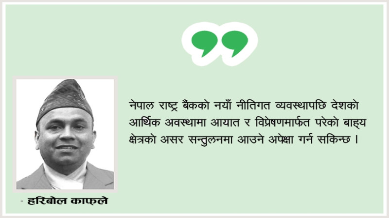 नेपाल राष्ट्र बैंकको नयाँ नीतिगत व्यवस्थापछि देशको आर्थिक अवस्थामा आयात र विप्रेषणमार्फत परेको बाह्य क्षेत्रको असर सन्तुलनमा आउने अपेक्षा गर्न सकिन्छ । बाह्यक्षेत्रको असरको विस्तारले पछिल्लो समय मुलुकको समग्र आर्थिक, वित्तीय, सामाजिक र अन्य क्षेत्रको समेत सन्तुलनमा विभिन्न दबाब सृजना भइरहेको थियो । पछिल्लो समय विश्व बजारमा तेलको मूल्यले अस्वाभाविक वृद्धि खेपेको र त्यसको मारमा विश्वका धेरै मुलुक परेकाले सम्भवतः सबै मुलुकले बाह्य दबाब नियन्त्रण गर्न नीतिगत व्यवस्थाहरूमा परिमार्जन गरिरहेका थिए । विदेशी स्रोतहरूको महत्त्वपूर्ण अंश आयातमा खर्च गर्नुपर्ने अवस्थामा नीतिको प्राथमिकता आयातप्रति कठोर हुने र विदेशी मुद्राको स्रोत थप परिचालन गर्नेतर्फ केन्द्रित हुनु सकारात्मक छ ।