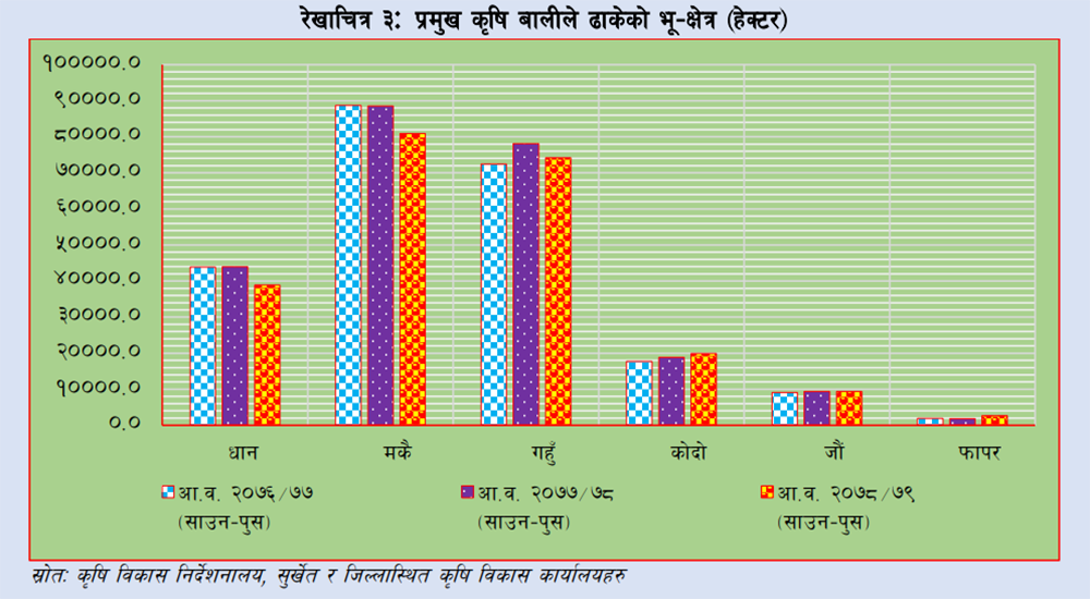 सुर्खेत\ गत आर्थिक वर्ष २०७८/७९ को ६ महिनामा कर्णाली प्रदेशमा समग्र कृषि बालीले ढाकेको क्षेत्रफल ६.०५ प्रतिशतले घटेको छ। नेपाल राष्ट्र बैंकको प्रदेशगत अर्धवार्षिक समीक्षाअनुसार आव २०७७/७८ को सोही अवधिमा यस्तो क्षेत्रफल ४.१२ प्रतिशतले बढेको थियो।