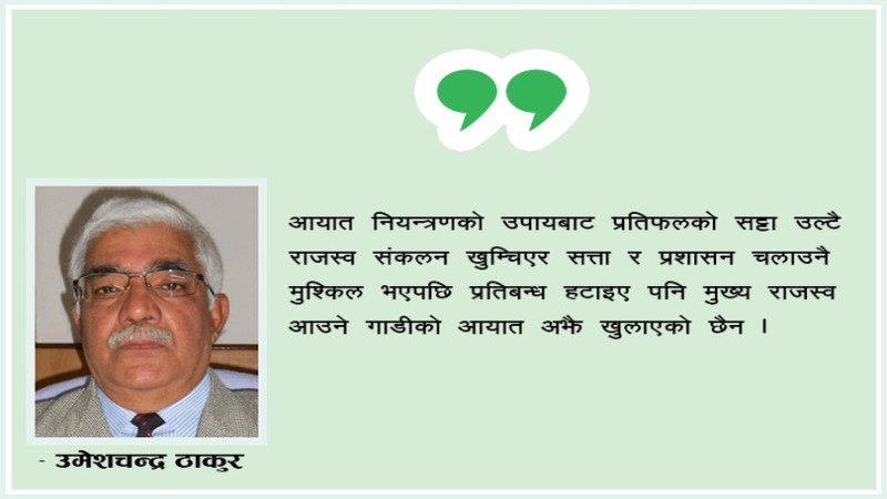 आसन्न चुनावपछि केही हुन्छ कि भन्ने आशमा निजीक्षेत्र देखिएको छ । आयात नियन्त्रणको उपायबाट प्रतिफलको सट्टा उल्टै राजस्व संकलन खुम्चिएर सत्ता र प्रशासन चलाउनै मुश्किल भएपछि प्रतिबन्ध हटाइए पनि मुख्य राजस्व आउने गाडीको आयात अभैm खुलाएको छैन । यसको आडमा अहिले पुराना गाडीको माग र मूल्यमा मनपरी चलिरहेको छ । सरकार यस्ता असंगतिको उपचारमा अनपेक्षित रूपमा उदासीन देखिएको छ । जरामा देखिएको समस्याको उपचार पातपातमा खोजेर सम्भव हुँदैन ।