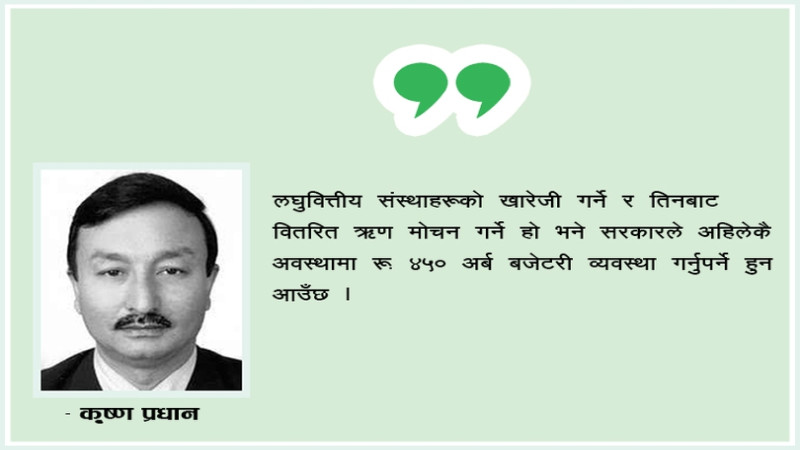 ऋणीहरू सडक आन्दोलनमै आउनु पक्कै पनि शुभ लक्षण होइन । निजीक्षेत्रका संघसंस्थाहरू नै सडकमा आउनु र तिनका सुझावसमेतले काम नगर्नु एकखाले अनौठो स्थिति हो । लघुवित्तीय संस्थाकै खारेजीको माग हुनुलाई पनि स्वाभाविक रूपमा हेर्न हुँदैन । यी सब परिदृश्यले के संकेत गर्छन् भने नेपालको वित्तीय क्षेत्रमा पक्कै पनि संरचनागत समस्याहरू छन् । तिनको बेलामै सम्बोधन गरिएन भने यो क्षेत्रप्रतिकै विश्वास डगमगाउने सम्भावनालाई पनि नकार्न सकिँदैन । प्रधान नेपाल राष्ट्र बैंकका पूर्वकार्यकारी निर्देशक हुन् ।