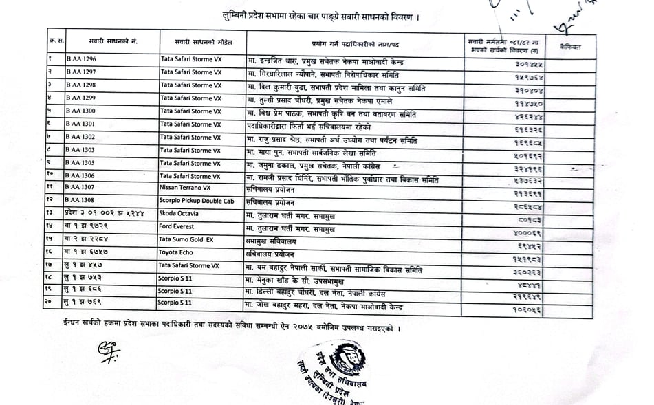 यो गत वर्षभन्दा १३ लाख ५० हजार ९८ रुपैयाँ बढी हो । मासिक तेल खर्च पनि उस्तै छ ।यी सवारीसाधन प्रदेशसभा सचिवालयले सभामुख, उपसभामुख, विषयगत समितिका सभापति, संसदीय दलका नेता, प्रमुख सचेतकहरूलाई प्रदान गरेको छ ।