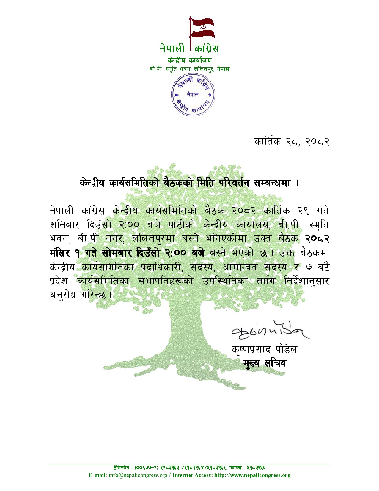 अब कांग्रेस केन्द्रीय कार्यसमिति बैठक सोमबार दिउँसो २ बजे बस्नेछ ।