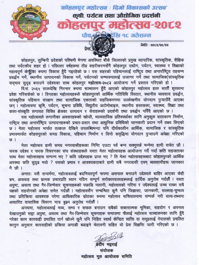 कोहलपुर उद्योग वाणिज्य संघका अध्यक्ष तथा महोत्सव मूल आयोजक समितिका संयोजक प्रदिप भट्टराईले बुधबार एक विज्ञप्ती जारी गर्दै महोत्सवका सन्दर्भमा फैलाइने भ्रामक सूचनाप्रति सचेत रहन आग्रह गरेका छन् । आधिकारिक जानकारीका लागि महोत्सव सचिवालयमार्फत सत्य-तथ्यमा आधारित विवरण लिन अनुरोध गर्दै महोत्सवलाई सफल बनाउन सबैको साथ आवश्यक रहेको विज्ञप्तीमा उल्लेख गरिएको छ ।
