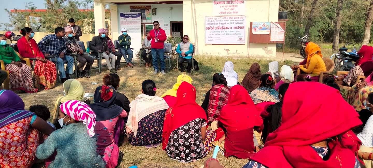 बाँके बैजनाथ \ बैजनाथ गाउँपालिका वडा न ७ मा १६ दिने लैङ्गिक हिंसा विरुद्ध एक दिने अभिमुखीकरण कार्यक्रम सम्पन गरिएको छ । बैजनाथ गाउँपालिकाको आयोजनामा महिला तथा बालकालिका शाखको सहजीकरणमा वडा न ७ मा १६ दिने लैङ्गिक हिंसा विरुद्ध अभिमुखीकरण गरिएको हो ।
